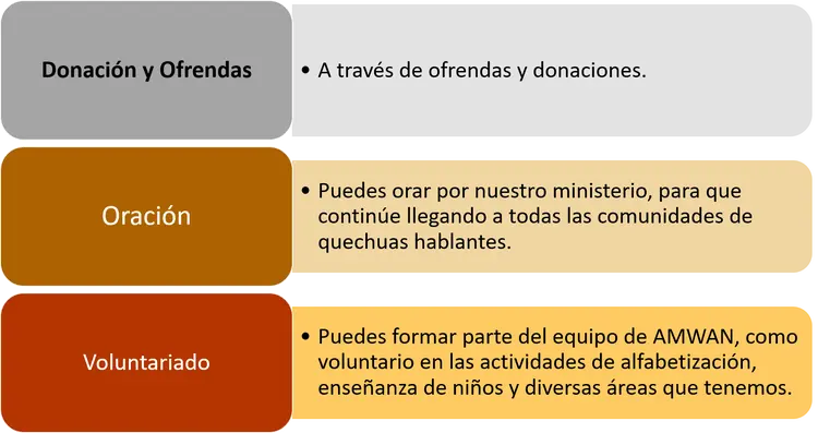 Si estás en USA, puede dar a través de Mission Funds in Full, indicando el nombre de la misión: AMWAN; quienes nos harán llegar el 100% de su ofrenda y del mismo modo les enviará un recibo para sus impuestos.